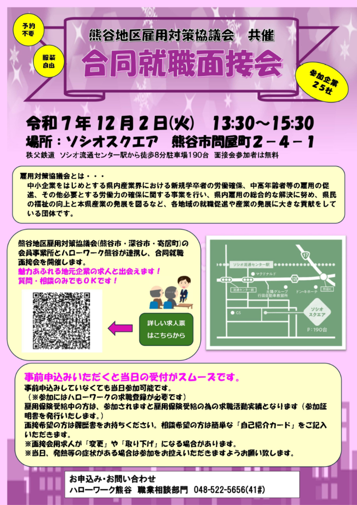 ハローワーク熊谷・熊谷地区雇用対策協議会共催の就活イベント「合同就職面接会」に出展致します。